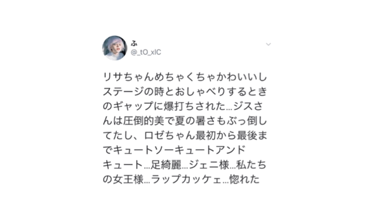 -كانت ليسا لطيفة للغاية عندما تحدثت على المسرح! جيسو، جمالها أقوى من حرارة الصيف! روزي من البداية إلى النهاية كانت لطيفة، لطيفة جدًا! ملكتنا جيني، كان الراب الخاص بها رائع جدًا! وقعت في الحب!