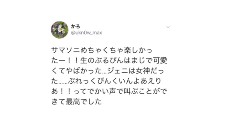 – حفل Summersonic كان ممتع للغاية! اداء بلاك بينك المباشر كان لطيف وجذاب، جيني حقًا إلهة! عندما صرخت ‘ بلاك بينك في منطقتك’ بصوت عالي! كان مذهل واللعنة