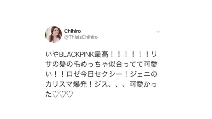 – لا أعرف بلاك بينك حقًا ولكن: جيني؟ انها مفعمة باللطافة!، ليسا؟ حصلت على الاسلوب( بمعنى انها جيده بالذي تقوم به ) ، روزي؟ مغنية جيدة جدا ، جيسو؟ جميلة مثل الممثلات الشهيرة! أنا لست بلينك ولكني أردت أن أغرد حول كيف كانوا بلاك بينك لطيفات وأنا بدأت أحبهم