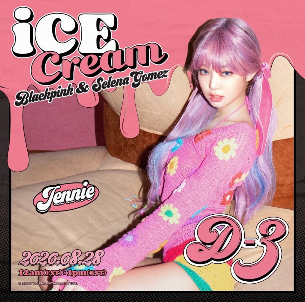 ‏مستخدمين الانترنت الكوريين واقعين بجنون لجمال ولون شعر جيني الجديد في الصورة التشويقية لتعاون بلاك بينك وسيلينا قوميز القادم “ICE CREAM”