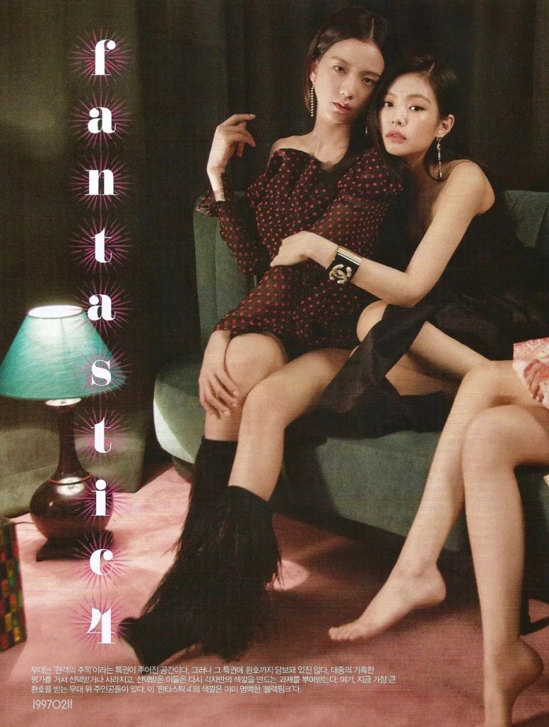 جيني: أممممم.. أعتقد أنه كان واضحًا بالفعل ولكن أيا كان ما نفعله، فإننا نحوله إلى شيء خاص ببلاك بينك؟ الفنانين الآخرين يقومون بالمزيد من الأنشطة الأخرى بخلاف العروض الموسيقية مثل الظهور في العروض المتنوعة أو القيام بجلسات تصوير مثل اليوم، أما نحن عندما نقوم بعمل جلسة تصوير، نتحول إلى عارضات رائعات، عندما نظهر في العروض المتنوعة، فإنه يجعلنا نشعر بالسعادة عندما يعتقد الناس أننا “مرحات و لطيفات حقا هذا الأمر يجعلني أشعر وكأنني أعمل بشكل جيد كعضوة في بلاك بينك ” عندما أتمكن من التكيف بشكل جيد مع أي صورة أحاول تصويرها