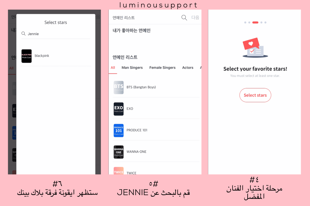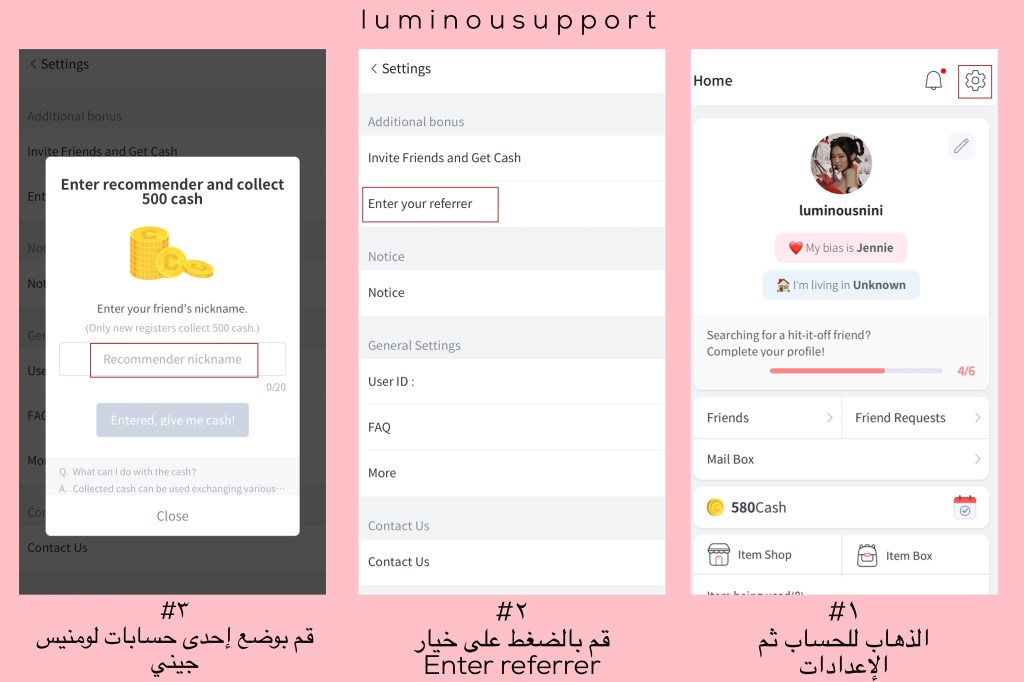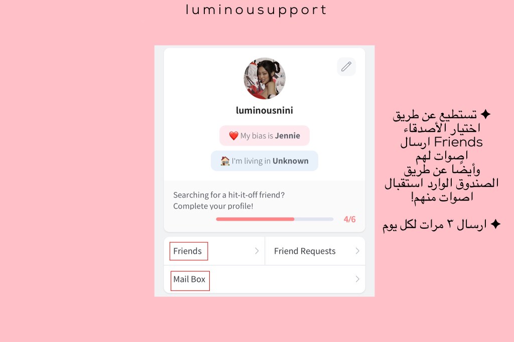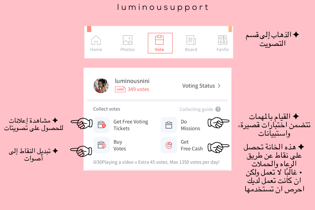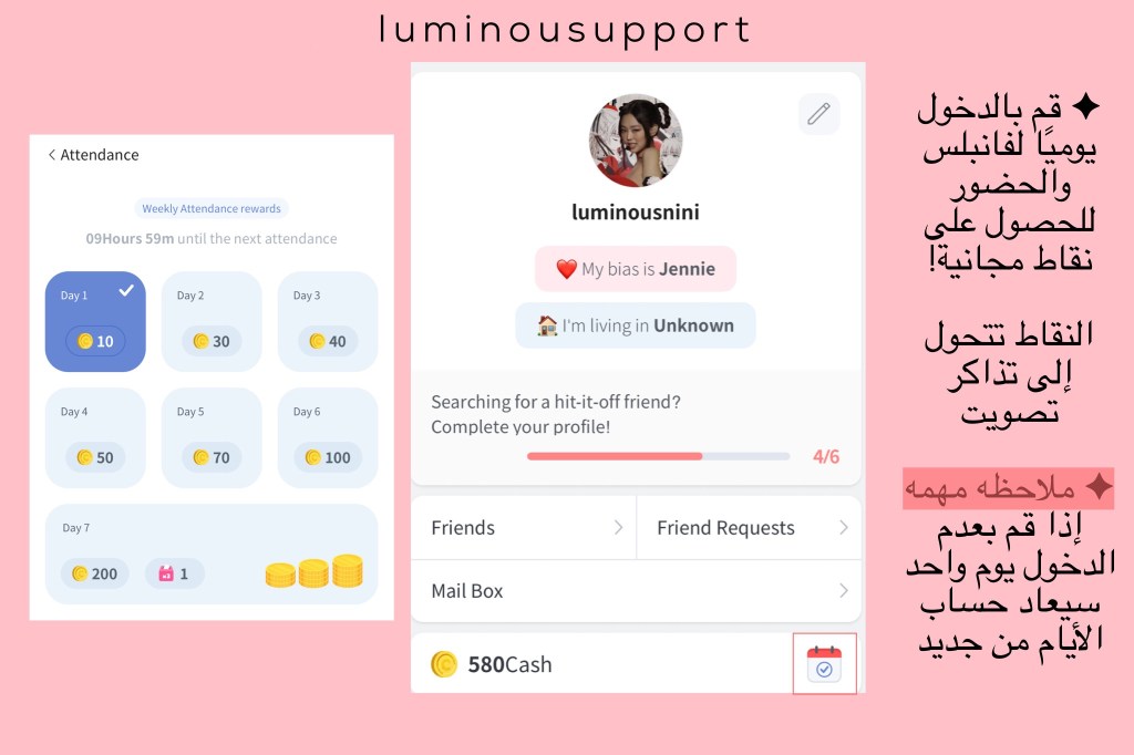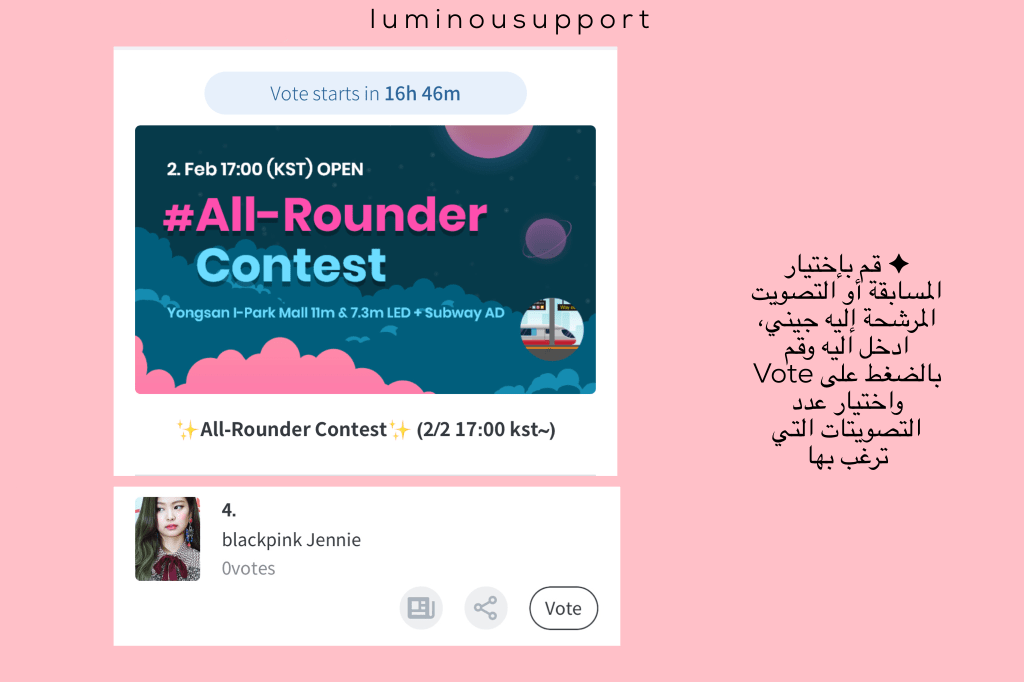 ✦ وضع إحدى حسابات لومنيس luminousnini أو luminousupport، يعطى كلا لومنيس والمستخدم ٥٠٠ نقطة بحيث نستطيع تحويلها إلى تذاكر تصويت